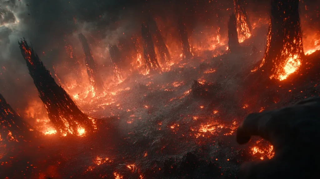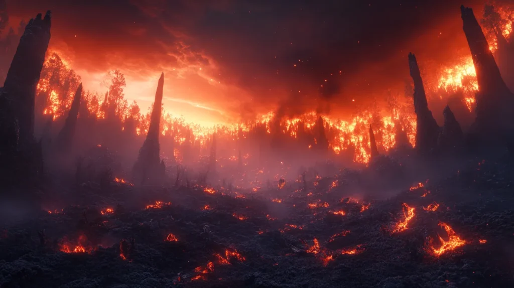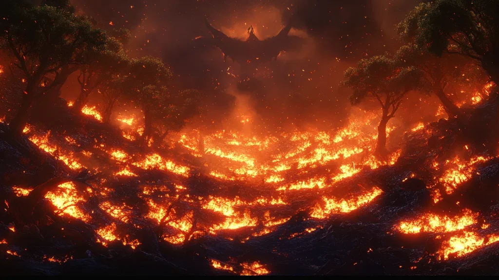 Les dragons ont tout dévoré. Les flammes, rouges et brûlantes, lèchent chaque arbre, chaque feuille, ne laissant derrière elles qu’un désert de cendres. La magie qui t’entourait, ces lumières dansantes et ces murmures doux, a disparu. Le paysage est devenu brutal, presque trop réel. La forêt n’est plus qu’un souvenir, un tableau de ruines.